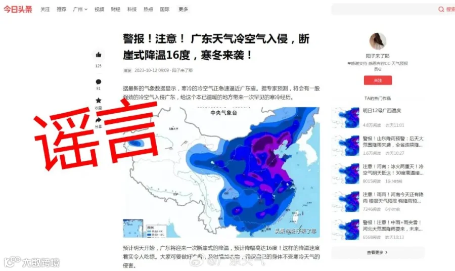 据悉,一名网友10月12日在今日头条平台发布了标题为《警报!注意!广东天气冷空气入侵,断崖式降温16度,寒冬来袭》的网文,称“预计明天开始,广东将迎来一次断崖式降温,预计降幅高达16度”。此网文一出,引起网友关注,并有网友向气象部门求证。