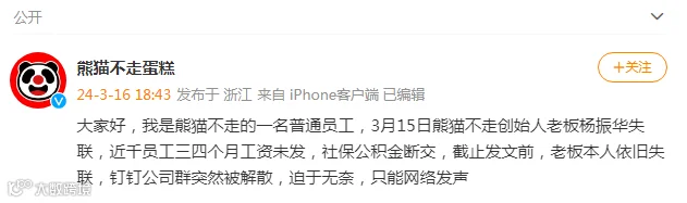 有人自称“熊猫不走蛋糕”员工,其称3月15日熊猫不走创始人老板杨振华失联,近千员工三四个月工资未发,社保公积金断交,截止发文前,老板本人依旧失联,钉钉公司群突然被解散,迫于无奈,只能网络发声。