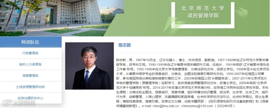 据北师大政府管理学院官网介绍,陈志新,男,1967年10月生,辽宁北镇人,博士,中共党员,副教授。1987-1990年在辽宁师范大学图书情报学系,获专科文凭。1990-1995年在辽宁省图书馆采编部外文组,任组长,1991年荣获“辽宁省图书馆先进工作者”称号。1995-1998年在北京大学信息管理系,分类法研究方向,获硕士学位。1998年至今在北京师范大学,从事图书馆学专业的信息组织、分类法、主题法和搜索引擎研究方向。1999-2007年在搜狐公司兼职,参与搜狐网络分类和搜狗搜索引擎的工作,2003年获搜狐公司“长期服务奖”。2007-2011年北京师范大学政府管理学院(原管理学院)在职学习,政府信息资源管理研究方向,获博士学位。2009年荣获“北京师范大学十佳辅导员”称号。2014-2017年支援北京师范大学珠海分校,在珠海工作两年后回北京校本部。