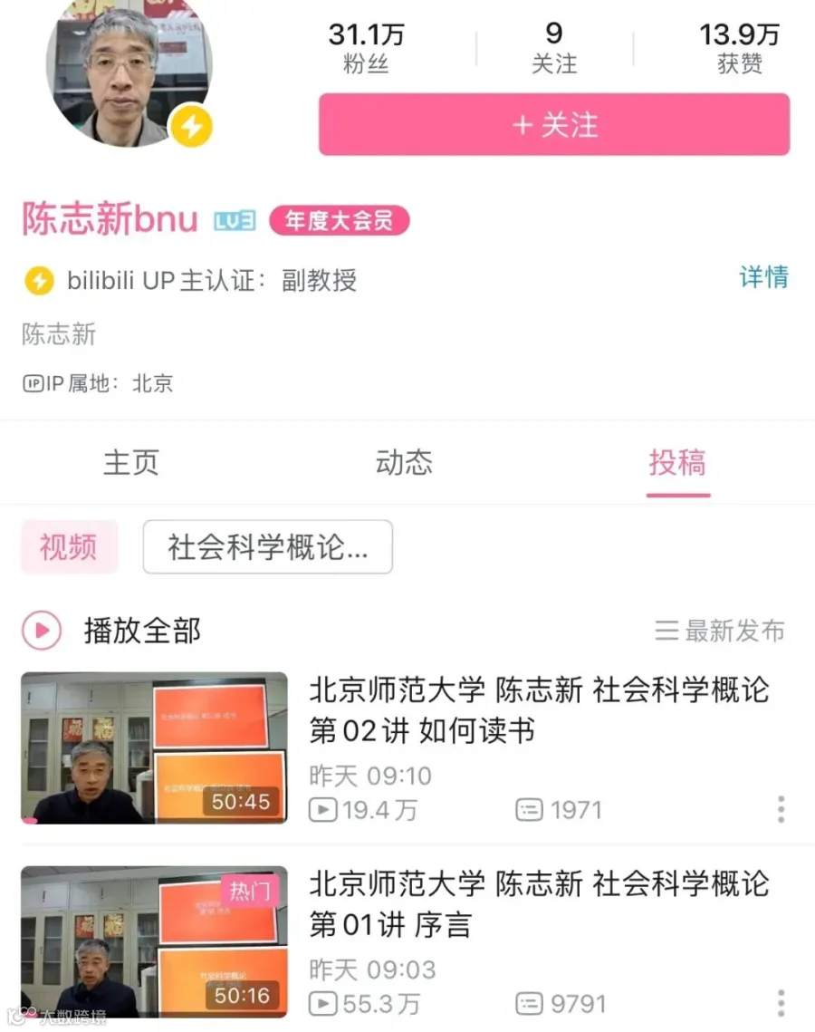 在陈志新老师的B站主页,他的这门社会科学概论包括序言、如何读书、自然科学、哲学、美学、新闻传播学、人工智能、历史学、考古学、宗教学、伦理学、心理学、法学、军事、文学艺术等多门学科内容,最长一个视频时长超过一个小时,每节课都会在下课的课件上打上“再见”两个字,仪式感满满。