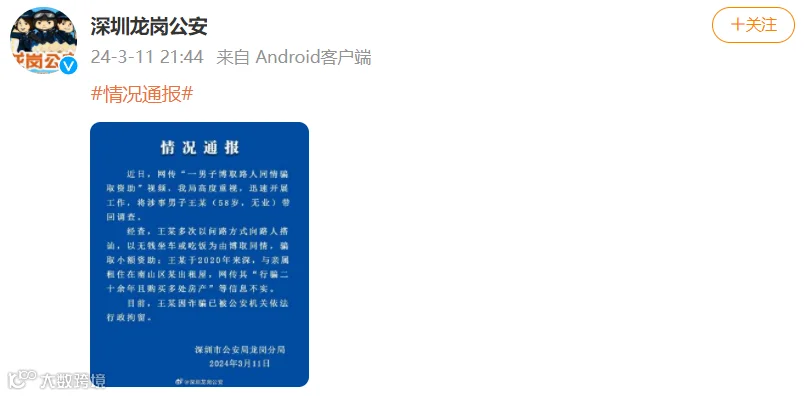 3月11日晚,深圳警方通报男子因诈骗已被公安机关依法行政拘留。