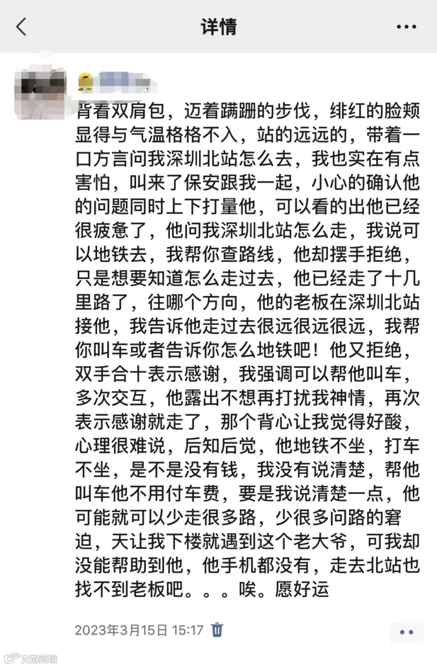 据该博主分享,他走在路上突然被一个爷爷问深圳北站怎么走,他一导航发现有十多公里,走路要3个多小时,“听到要走路到北站我都震惊了!”