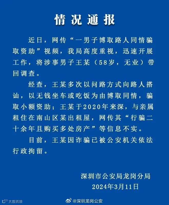 经查,王某多次以问路方式向路人搭讪,以无钱坐车或吃饭为由博取同情,骗取小额资助;王某于2020年来深,与亲属租住在南山区某出租屋,网传其“行骗二十余年且购买多处房产”等信息不实。
