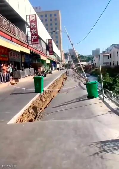 现场画面显示,塌陷深度约一米,有路灯随着地面塌陷发生倾斜,道路的一侧是一排农产品店铺,另一侧是一条河涌。