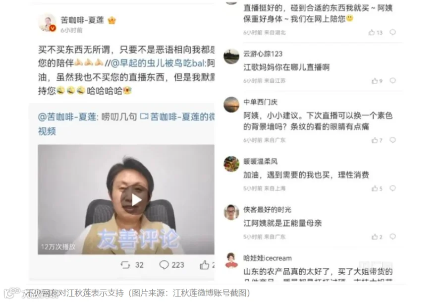 天眼查APP显示,今年5月,由江秋莲全资持股的青岛胡杨树文化传媒有限公司成立,其法定代表人、执行董事兼经理均为江秋莲,注册资本10万人民币,经营范围包括组织文化艺术交流活动、食品互联网销售、互联网销售、日用百货销售、酒类经营等。