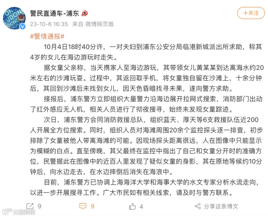 该女童于10月4日在海滩走失后,其父发布的寻人信息在网络引发了大量关注。10月6日,上海浦东警方通报称,直至傍晚,其父最终在监控中指出了自己和女童分开时的准确方位,民警据此在图像中的近百人里发现了疑似女童的身影,其在原地等候约10分钟后,向水边走去,在水边摔倒后消失在海浪中。