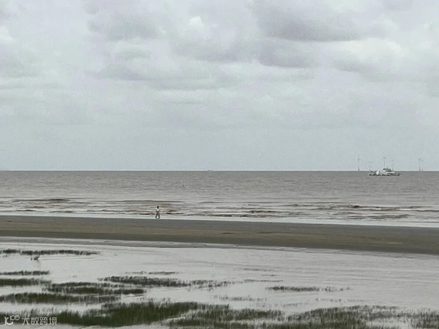 视频中有一个模糊的人影,疑似穿着蓝色裙子,独自在海边滩涂上行走。