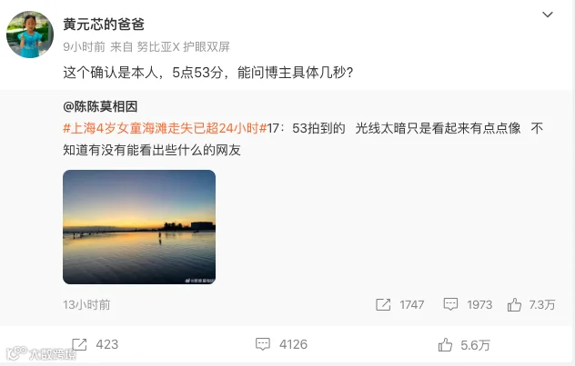 10月6日,上海蓝天应急救援队相继发布多段视频和多篇图文,称疑似是网友拍摄到黄元芯走失前的画面。