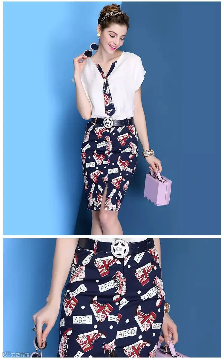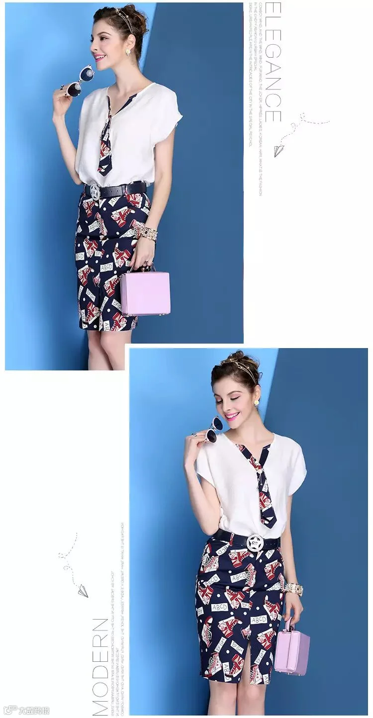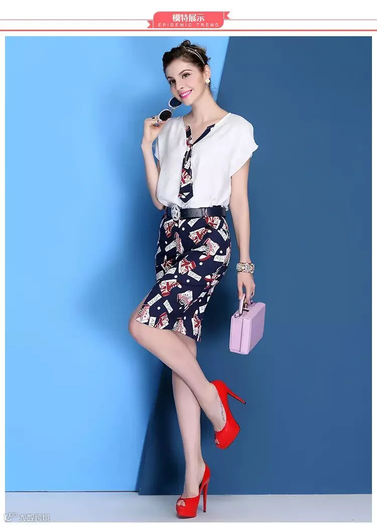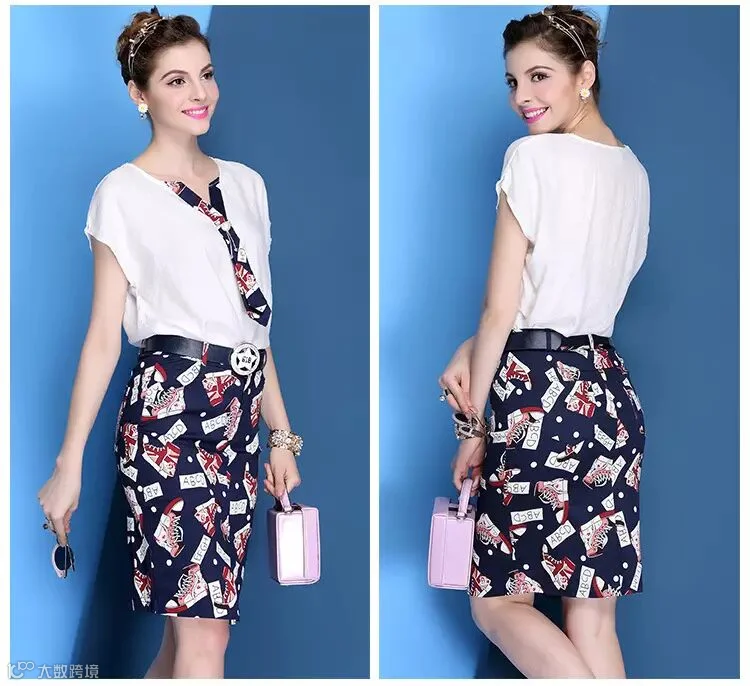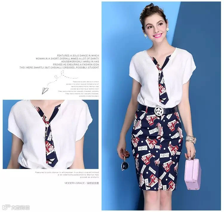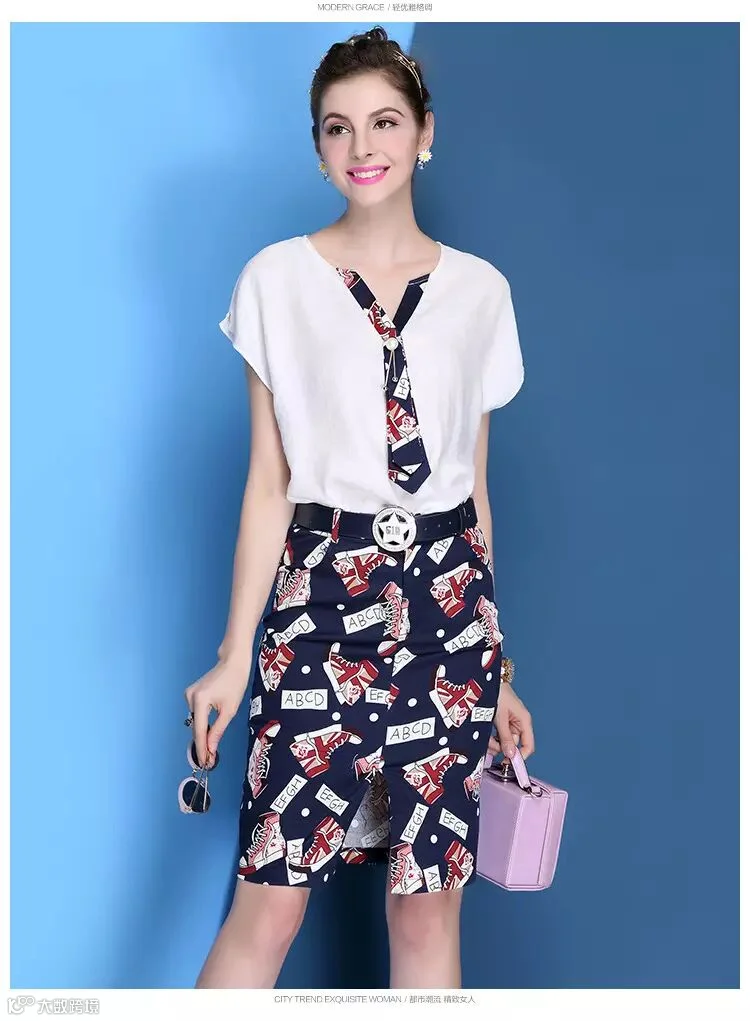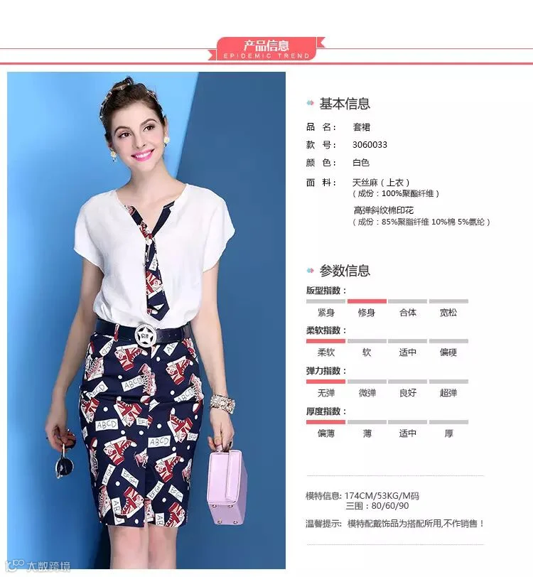 V领天丝麻T恤+印花包臀裙(179包邮)送腰带