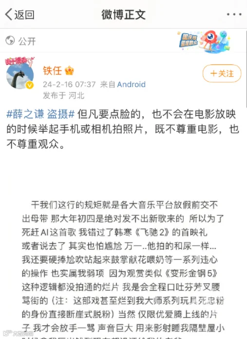 2月15日,薛之谦发微博,表示自己走进影院,观看韩寒导演电影《飞驰人生2》,然后“我看哭了……而且是被热血哭了……”