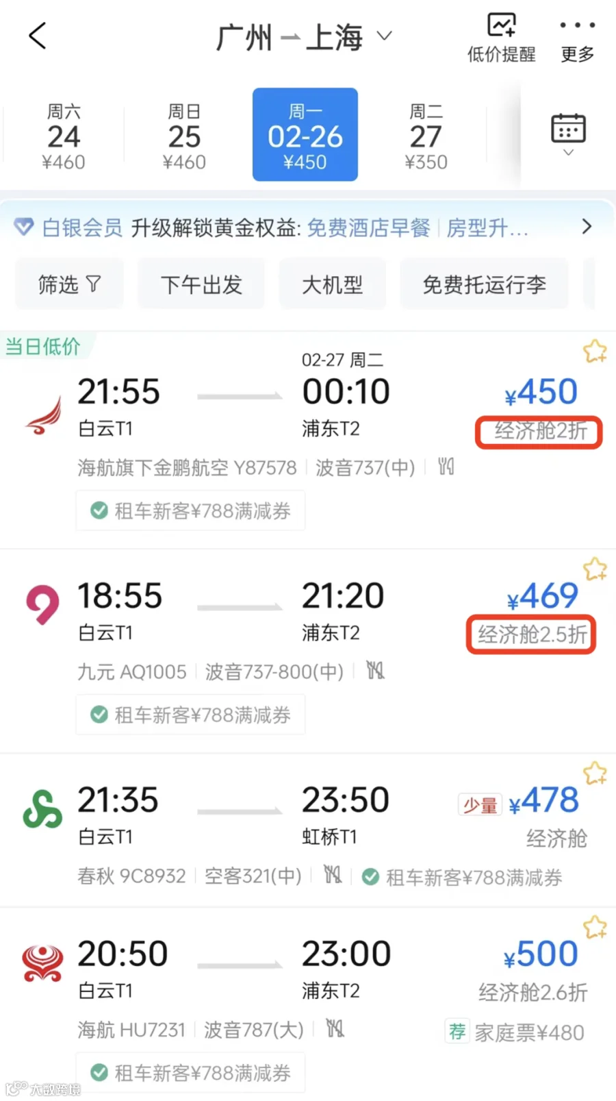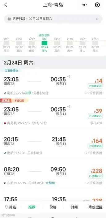 某旅行服务平台数据显示,2月21至29日,北京前往三亚的机票价格多在300元以下,2月下旬从上海出发前往重庆、长沙、大连、西安、成都、贵阳等目的地均有百元以下的机票可以选择,部分机票低至0.3折。