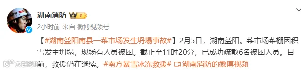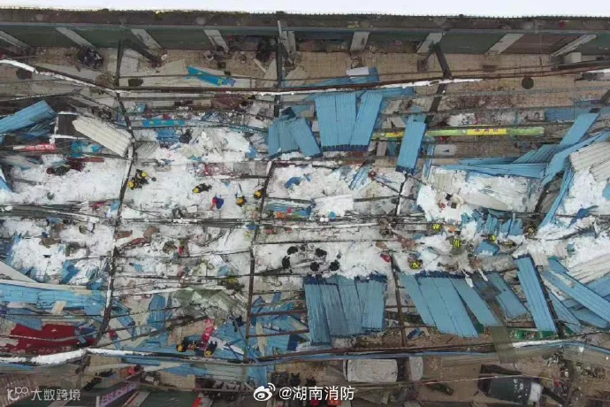 据湖南消防消息,菜市场菜棚是因积雪发主坍塌,现场有人员被困。