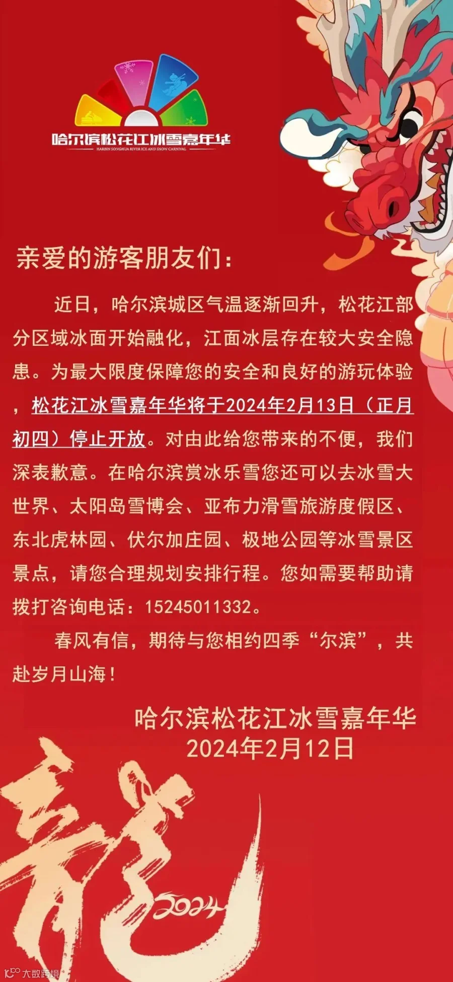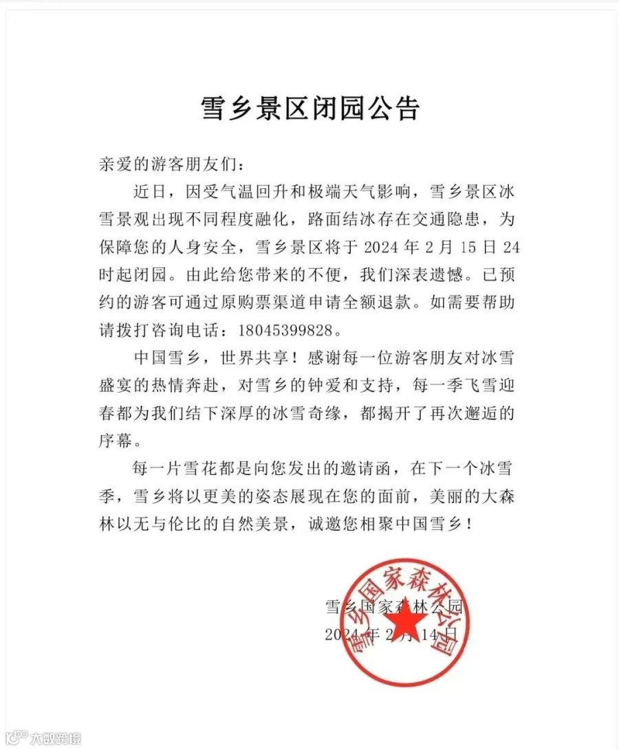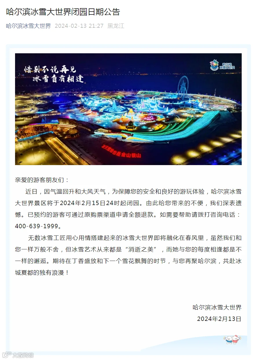 2月13日,哈尔滨冰雪大世界发布闭园日期公告。公告中说明,因气温回升和大风天气,哈尔滨冰雪大世界景区将于2024年2月15日24时起闭园,已预约的游客可通过原购票渠道申请全额退款。