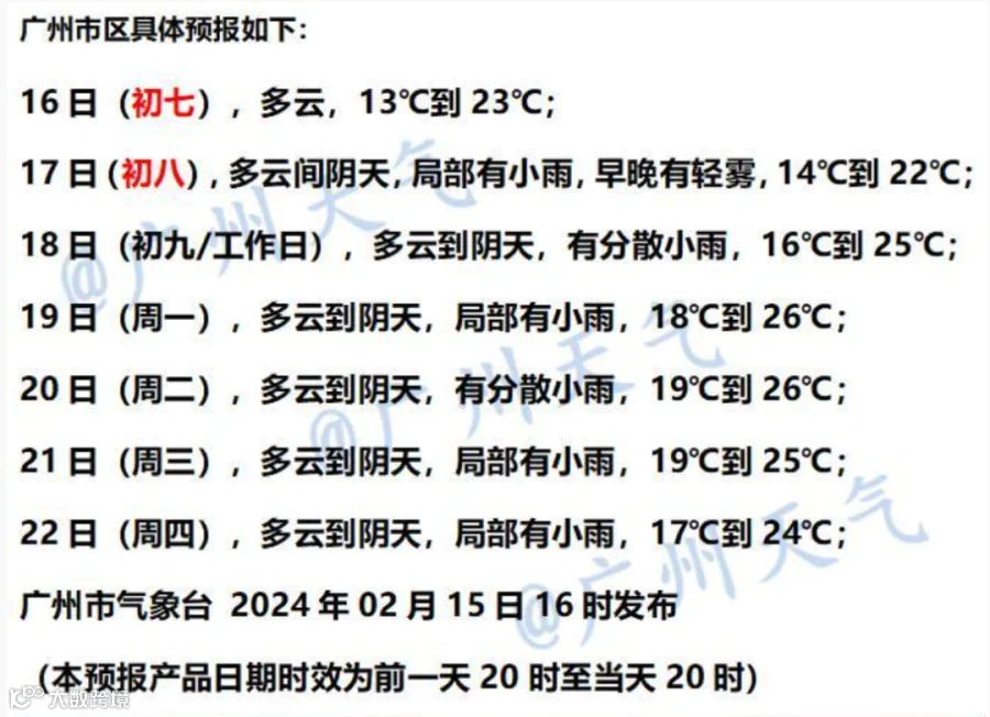 16日(初七),全省多云。早晨最低气温:粤北偏北市县7~11℃,南部市县15~18℃,其余市县12~15℃。