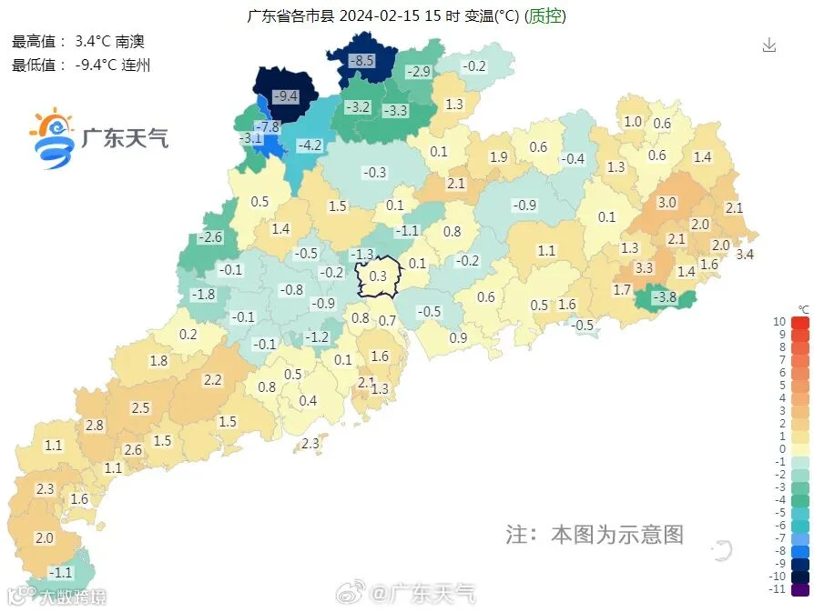据@广东天气 消息,预计,2月16日-19日,广东省云量增多,大部市县和粤西海面(包括琼州海峡)有(轻)雾和分散性零星小雨,部分时段雨雾时能见度低于1公里;其中15日(初六)大部市县气温回升,昼夜温差大,早晚寒凉,16日-17日(初七到初八)受弱冷空气影响,气温略降1~3℃;18-19日,气温回升,湿度加大。