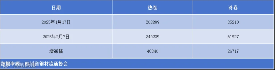 据四川省钢材流通协会统计,本周成都地区样本库房中热卷库存量为249239吨,较上周增加40340吨。冷卷库存量为61927吨,较上周增加26717吨。