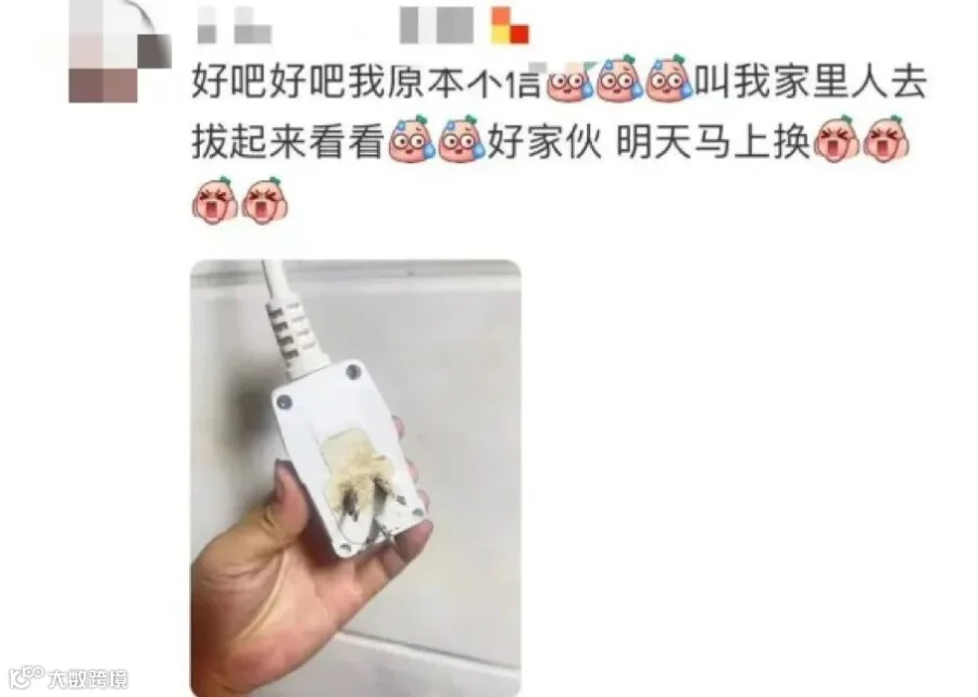 无端端闻到塑料烧焦的味道,没几天卫生间接风筒插头的那条线路就烧起来了。