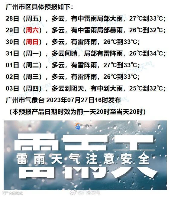 雨的方面,预计28日至29日,受“杜苏芮”外围雨带影响,广州有中雷雨局部暴雨,局部伴有8级左右短时大风。最强降水时段将出现在28日午后至傍晚和29日凌晨至早晨。30日起,降水逐渐减弱,广州的高温将有所缓解。