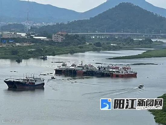 7月16日,阳东区那龙河尖山段,有关部门组织小艇来回穿梭,引导船只有序抛锚停泊。