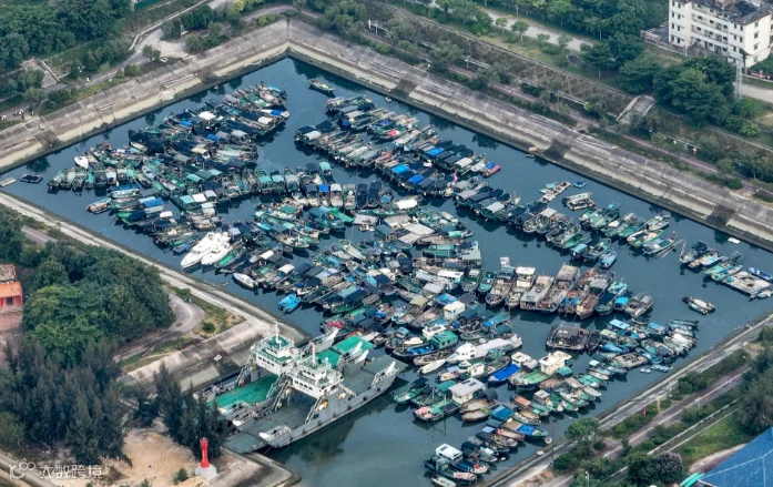 在特呈岛避风港,300多艘船只停泊在港内避风。