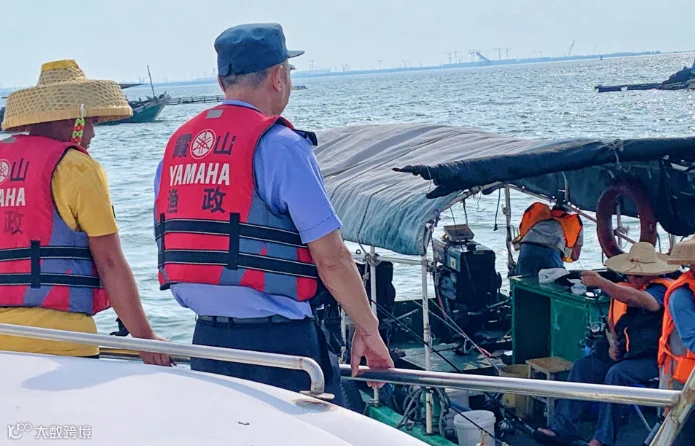 湛江霞山区海洋综合执法大队在渔港巡查,要求渔船落实防台风要求。