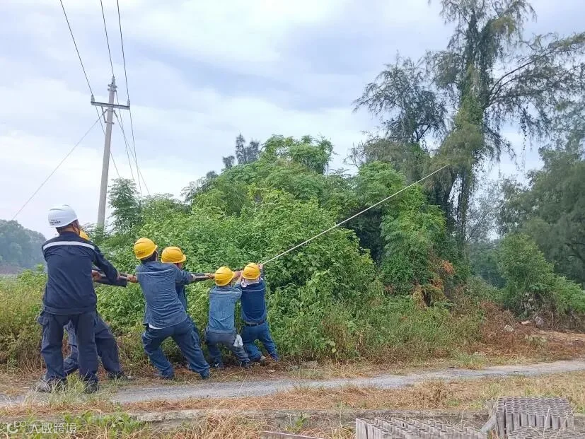 茂名电白供电局博贺供电所工作人员齐心协力将超高树木拉低以便砍伐,避免影响附近供电线路。