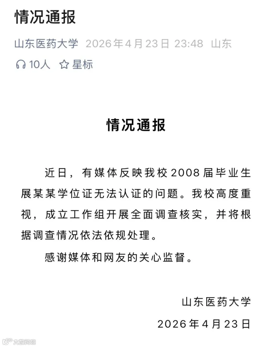 2025年,他发现自己的学位证已无法在网上查到,而山东医药大学告诉他,校方未能查到授予其学位证的相关记录。“不能证明学位证的真实性,给我找工作造成了严重影响。我明明已领取了学位证,但我想自证非常困难,甚至不可能(自证)。所以,我干脆举报我自己,希望用这种方式,倒逼相关部门展开核查。”