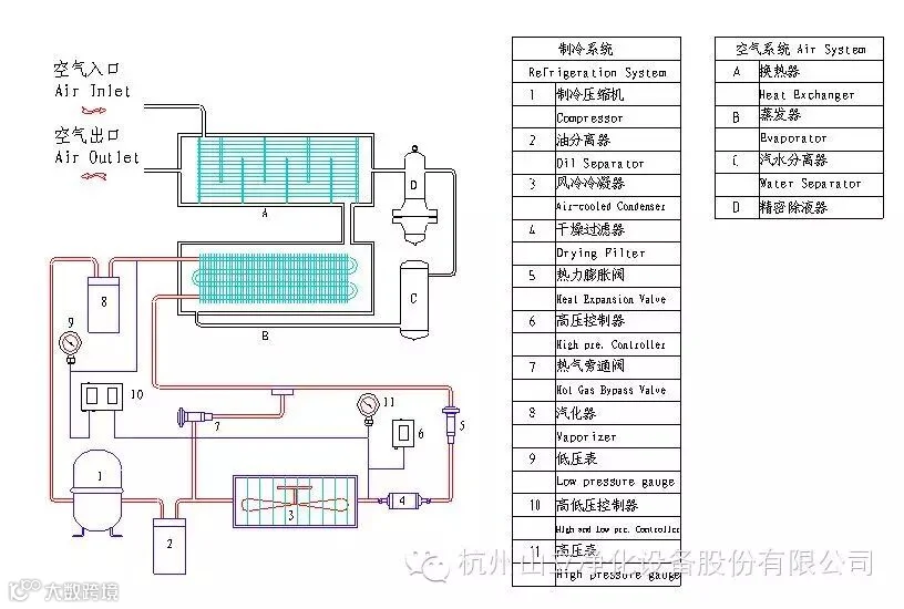 降低压缩空气的温度可减少压缩空气中的水蒸气含量,而多余的水蒸气会凝结成液体,再把液态水除去,从而使压缩空气达到干燥的效果。冷干机就是利用这一原理来工作的。