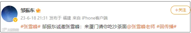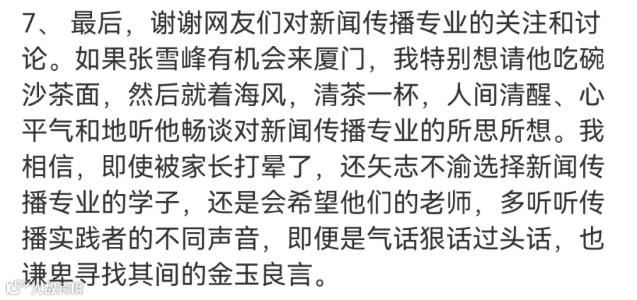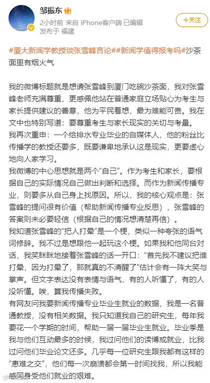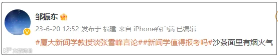 6月20日中午,厦门大学新闻传播学院教授邹振东再次通过个人微博发表了意见。他发文称:张老师成于烟火气,新闻传播专业需要听到不同的声音,尤其是带有烟火气的声音。