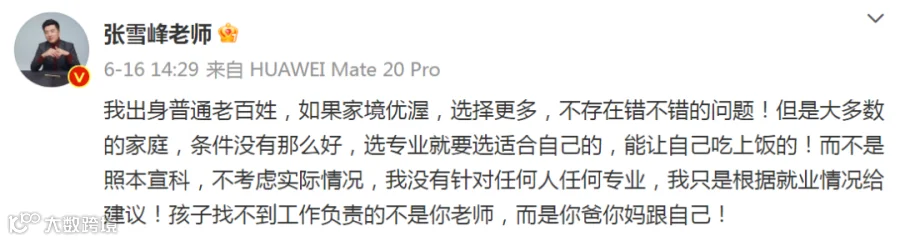 16日下午,张雪峰发微博回应:我出身普通老百姓,如果家境优渥,选择更多,不存在错不错的问题!但是大多数的家庭,条件没有那么好,选专业就要选适合自己的,能让自己吃上饭的!而不是照本宣科,不考虑实际情况,“我没有针对任何人任何专业,我只是根据就业情况给建议!孩子找不到工作负责的不是你老师,而是你爸你妈跟自己!”