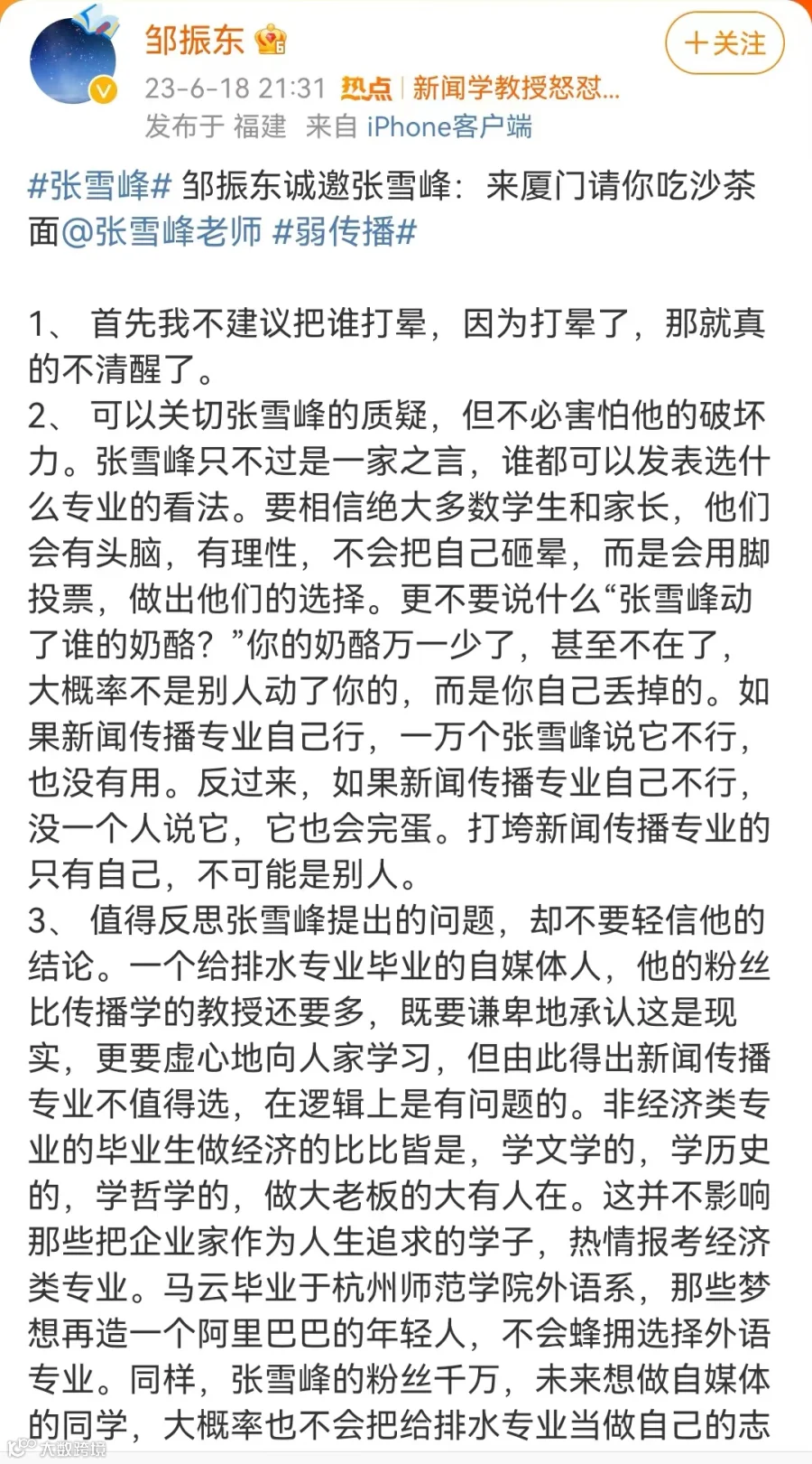 6月18日晚间,又一“网红教授”、厦门大学新闻传播学院教授邹振东通过微信公众号和个人微博发表了自己的看法:值得反思张雪峰提出的问题,却不要轻信他的结论。