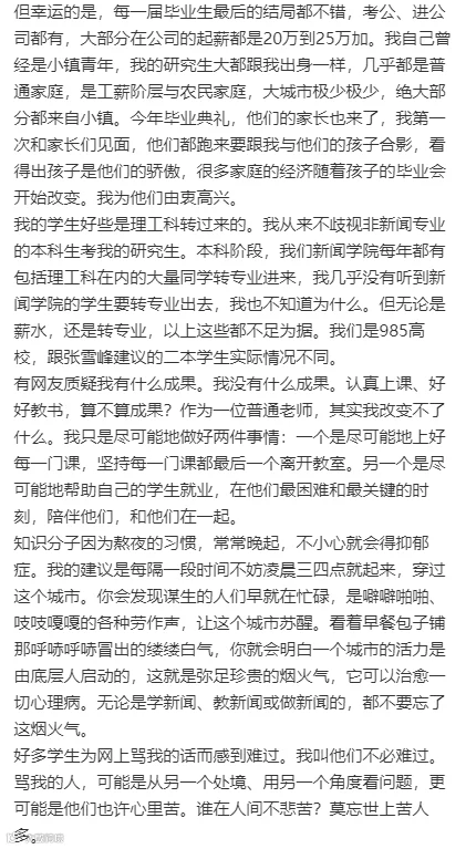 针对上述回应,17日下午,张小强再次接受媒体采访时表示:“家庭条件自然也是学生选专业的一个考虑因素,但我们国家现在的助学体系、机制还是比较完善,不管什么家庭条件,都能够完成各种专业的学习。并且,未来社会对传播人才需求会一直旺盛,新闻学专业的就业形势是比较乐观的。”