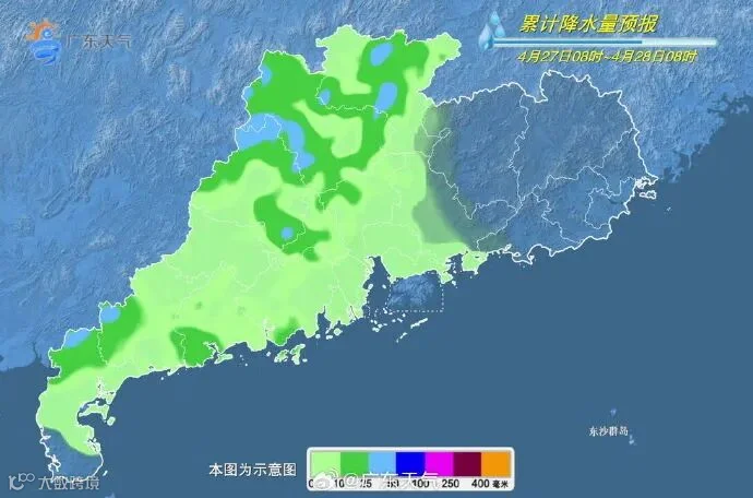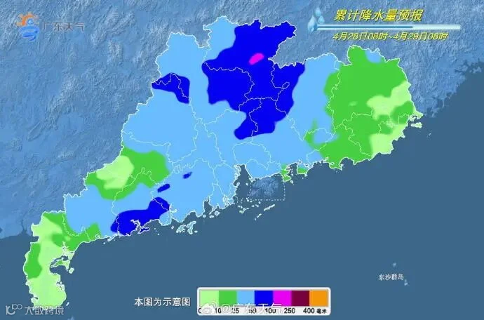 4月28日,清远、韶关、粤西和珠三角大部分市县有大到暴雨局部大暴雨,并伴有短时强降水、8~10级雷雨大风等强对流天气,其余市县多云到阴天,有(雷)阵雨局部大雨。最高气温:南部市县26~28℃,其余市县22~25℃。