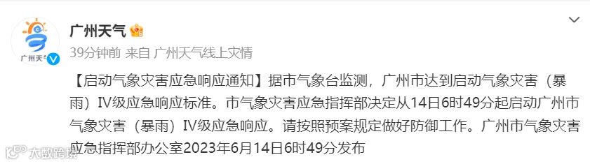 启动广州市气象灾害(暴雨)