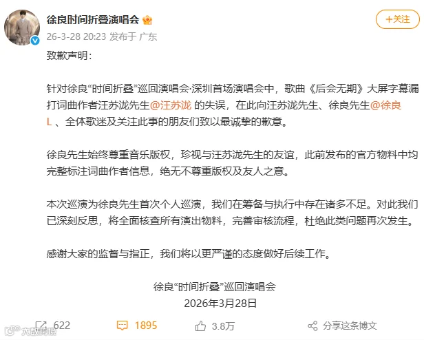 2026年3月27日当晚,徐良在深圳举办演唱会,演唱经典曲目《后会无期》时,现场大屏的词曲署名从长期沿用的 “汪苏泷 / 徐良”,直接显示仅 “徐良” 单人,抹去汪苏泷的创作署名。