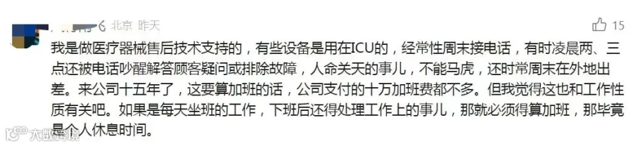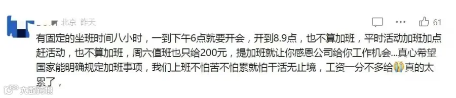 网友5:这个要看工作岗位和内容了,我是做销售的,工作弹性比较大,平时基本上不会加班,甚至有时候提前下班,周末偶尔跟客户对接些事情也正常,我个人觉得这种就不算加班。但是职能岗坐班有固定上下班时间的,周末应该算加班。