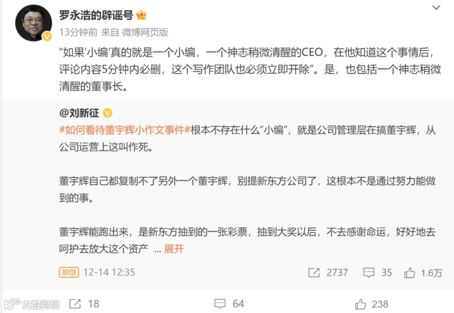 12月16日晚间,俞敏洪和董宇辉同时现身直播间,回答近期东方甄选“小作文”事件中网友关注的问题。