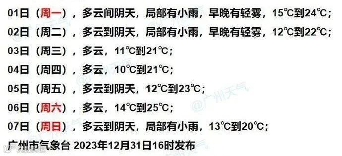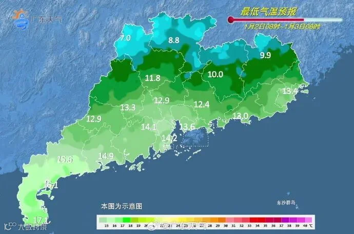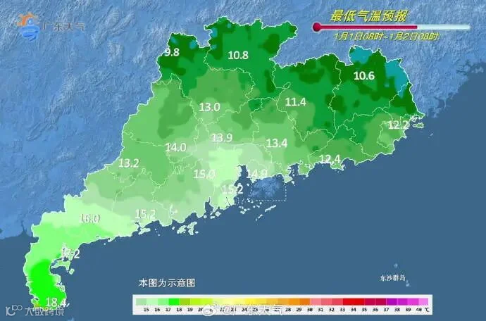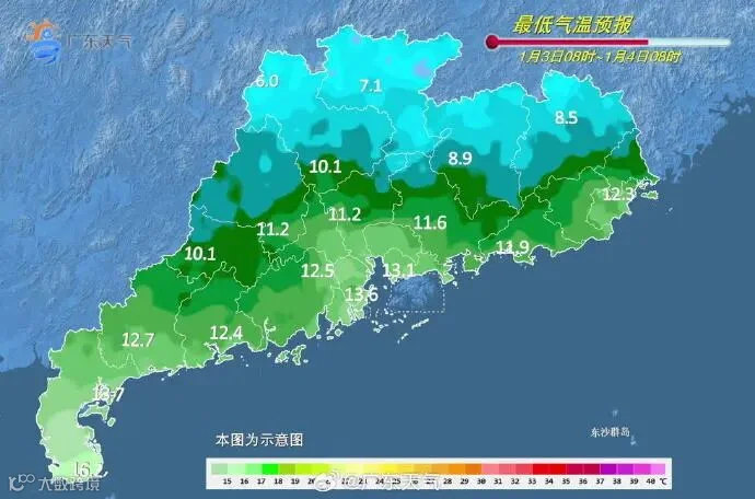 1月3日,粤西和珠三角西部阴天有分散小雨,其余地区多云。早晨最低气温:粤北的北部市县、肇庆北部7℃~10℃,粤西市县15℃~18℃,其余市县11℃~14℃。
