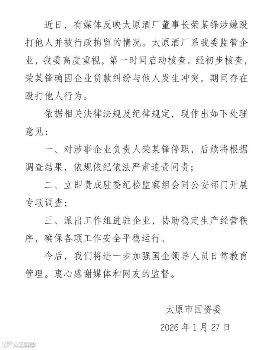 近日,有媒体反映太原酒厂董事长涉嫌殴打他人并被行政拘留的情况。太原酒厂系我委监管企业,我委对此高度重视,已第一时间组织相关部门召开专题会议,并同步启动核查。经初步核查,该企业负责人荣某锋确因企业货款纠纷与他人发生冲突,期间存在殴打他人行为。