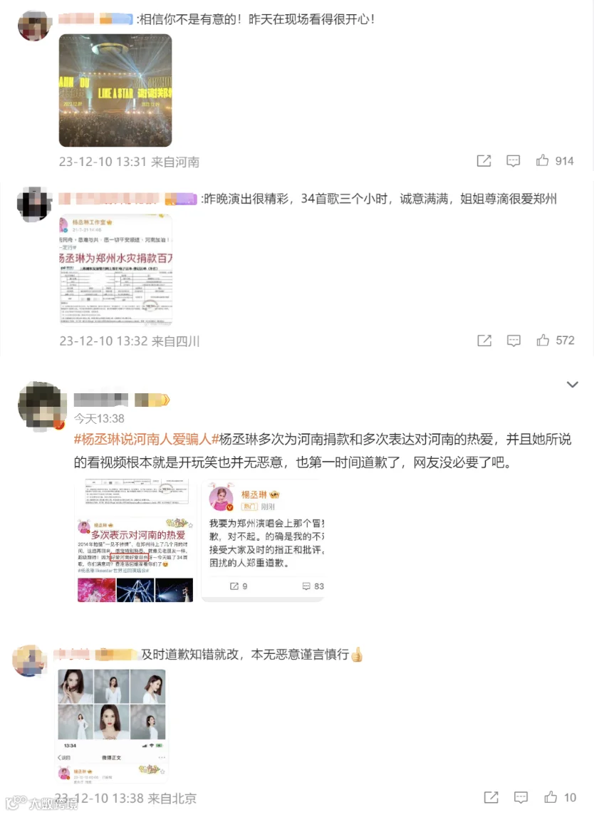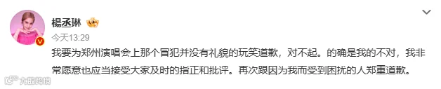 今天(12月10日),杨丞琳为演唱会不当言语致歉,杨丞琳写道:“我要为郑州演唱会上那个冒犯并没有礼貌的玩笑道歉,对不起。的确是我的不对,我非常愿意也应当接受大家及时的指正和批评。再次跟因为我而受到困扰的人郑重道歉。”