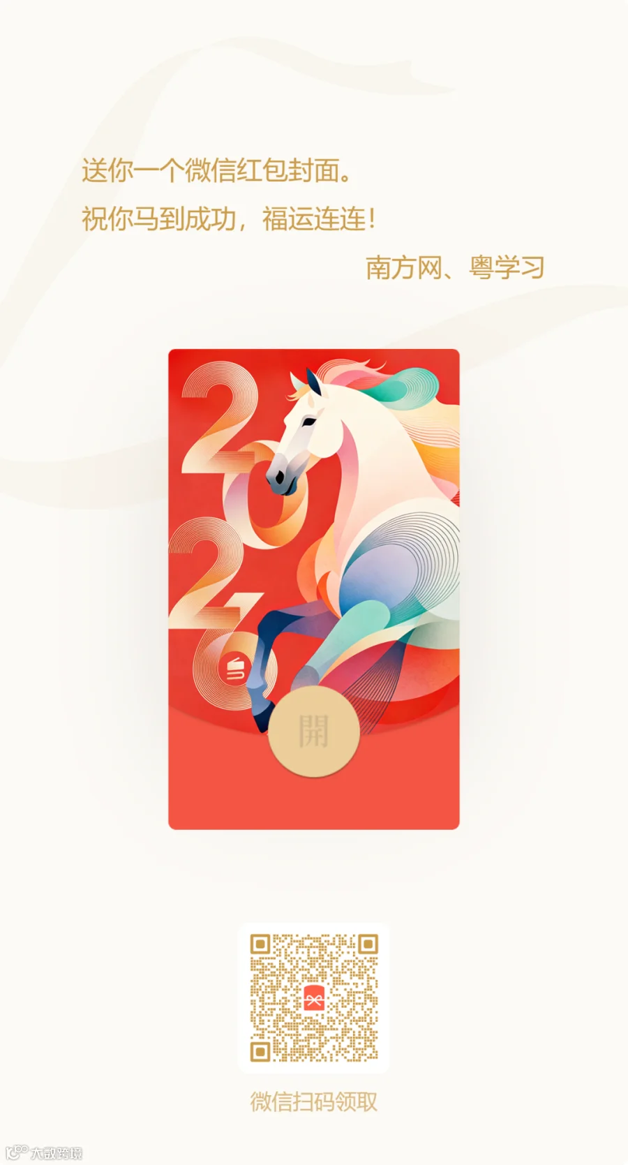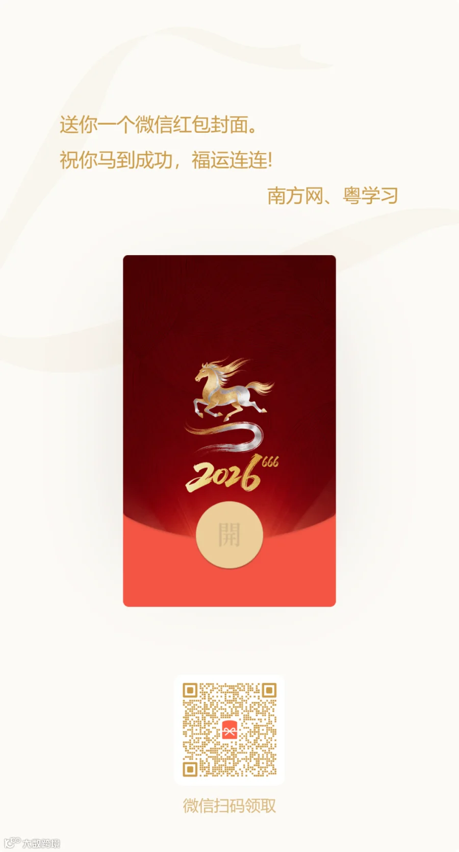 在2026丙午马年春节即将到来之际,南方网、粤学习客户端特别推出两款微信红包封面,双倍福气、双倍年味,一键承包你整年的好彩头!