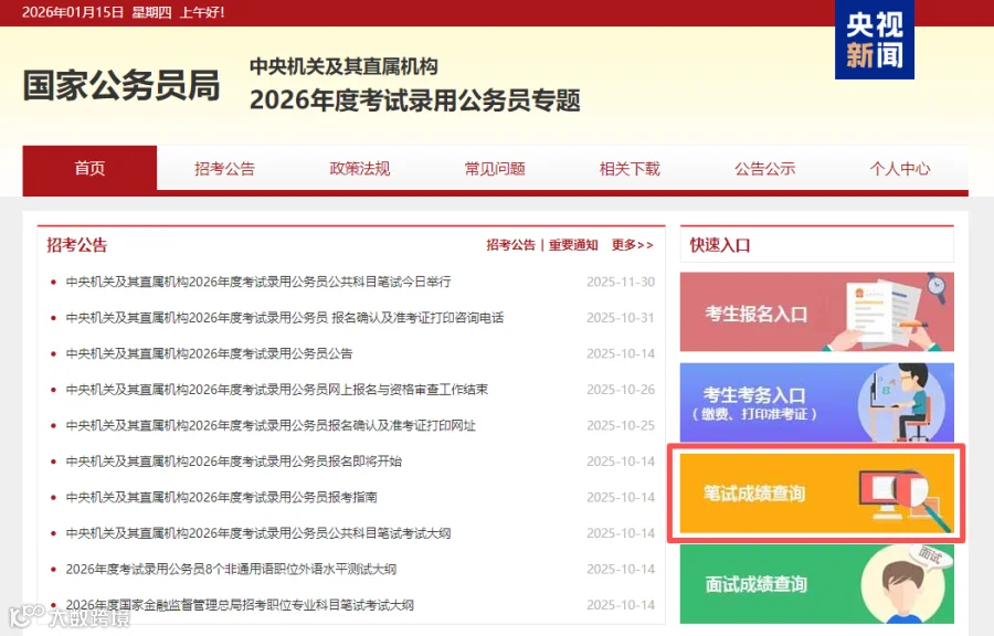 中央机关及其直属机构2026年度考试录用公务员笔试成绩和合格分数线公布,考生可于即日起登录“中央机关及其直属机构2026年度考试录用公务员专题网站”查询。