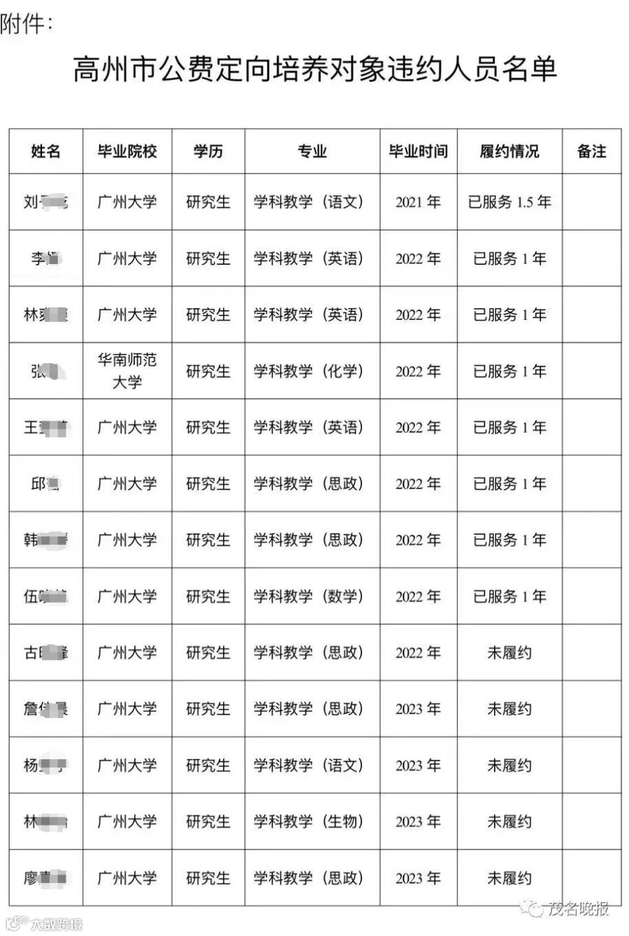 此前,多地也曾公布违约名单。9月27日,湛江市雷州市教育局公布了4名公费定向培养对象违约人员名单。9月28日,汕尾市陆丰市教育局公布了公费定向培养对象违约人员名单,5名今年6月毕业于华南师范大学的公费师范生因未履行约定被公开通报。