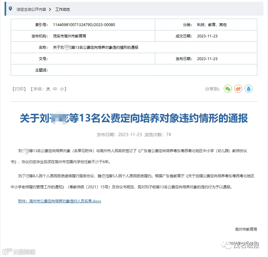 通报称,刘某某等13名公费定向培养对象与高州市人民政府签订了《广东省公费定向培养粤东粤西粤北地区中小学(幼儿园)教师协议书》,协议约定毕业后须在高州市范围内学校任教不少于6年。