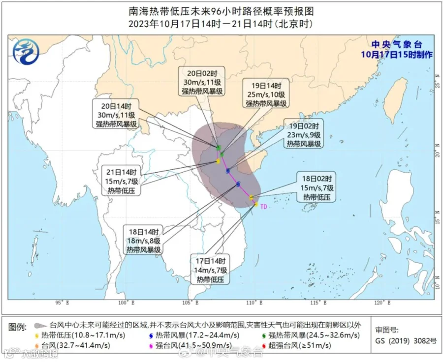 预计,该低压将以每小时5~10公里的速度向西北方向移动,逐渐趋向北部湾海面,强度逐渐加强,并可能于18日前后加强为今年第16号台风。