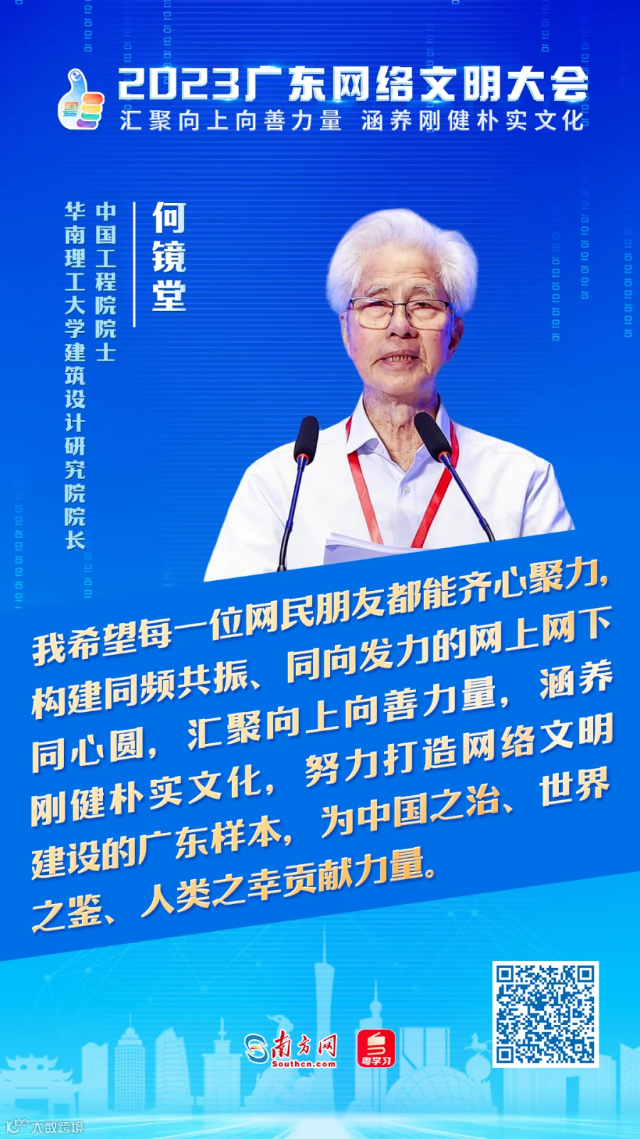 何镜堂称,作为一个设计师,他希望建筑成为文明的灯塔,也有责任借由建筑向公众传达这些文化内涵。作为一名普通网民,何镜堂向广大网民发起倡议,希望每一位网民朋友都能齐心聚力,构建同频共振、同向发力的网上网下同心圆,汇聚向上向善力量,涵养刚健朴实文化,努力打造网络文明建设的广东样本,为中国之治、世界之鉴、人类之幸贡献力量。