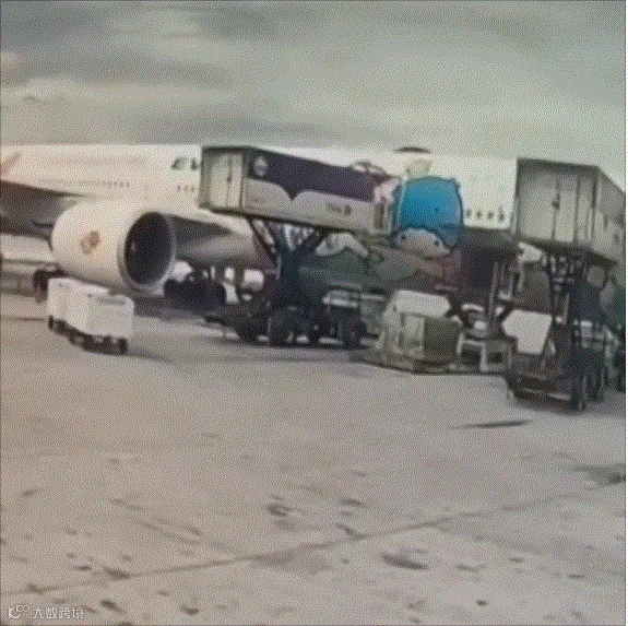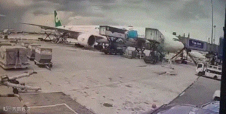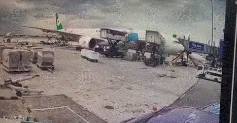 报道称,起飞前由于地勤工作人员的疏忽,两个行李装运箱与运输车断开。随后这两个大箱子径直冲向飞机,附近工作人员试图拦截未果。飞机右侧发动机罩被撞出一个大洞,航班已不适航,需要进行检修。