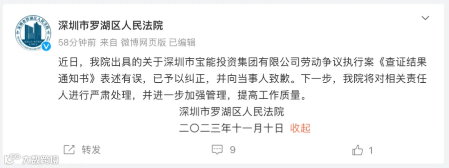 近日,我院出具的关于深圳市宝能投资集团有限公司劳动争议执行案《查证结果通知书》表述有误,已予以纠正,并向当事人致歉。下一步,我院将对相关责任人进行严肃处理,并进一步加强管理,提高工作质量。