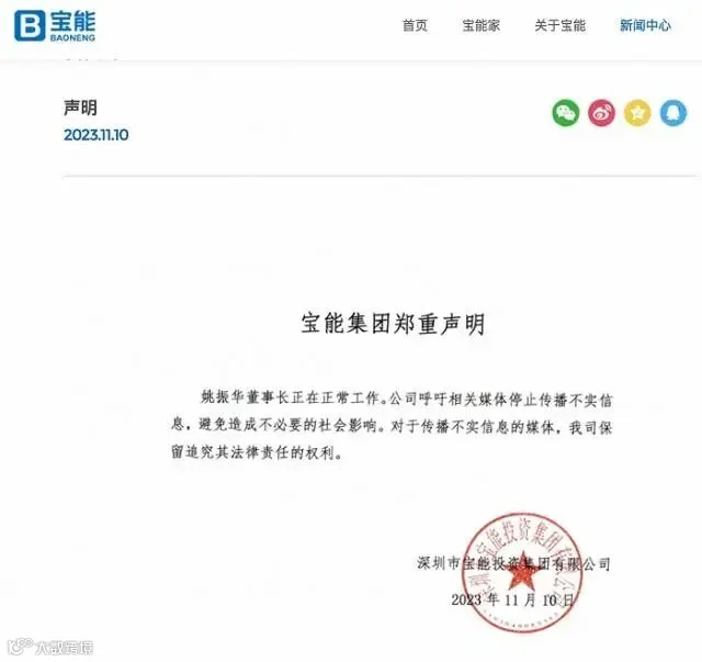 宝能集团10日发布声明称,姚振华董事长正在正常工作。公司呼吁相关媒体停止传播不实信息,避免造成不必要的社会影响。对于传播不实信息的媒体,我司保留追究其法律责任的权利。