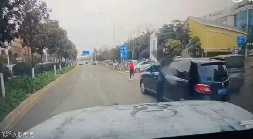 行车记录仪拍下的一段视频显示,1月6日下午4时17分许,一辆黑色商务车停在不断有车进出的停车场出入口,一女子站在车外,整理车内物品。后方一车辆疑要右拐进停车场,司机按喇叭提醒让路,女子却以不雅手势回应。随后,后车撞向前方商务车,女子摔倒在地。